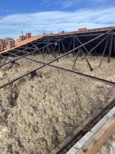 Projet : rénovation d’une charpente métallique, ponçage et traitement des aciers, pose d’un écran sous-toiture et isolation des combles.