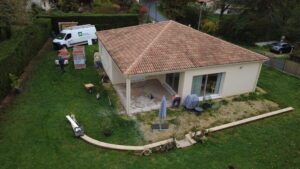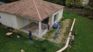 Transformation d’une terrasse couverte en une surface habitable (salon) : chape, murs, isolation, menuiseries, électricité, ravalement